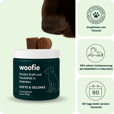 Bei Woofie vertrauen mittlerweile mehr als 9.000 Hundebesitzer auf unsere Gelenk-Nahrungsergänzungsmittel, um ihren Hund komfortabler, aktiver und glücklicher zu bewegen. Von verspielten Welpen bis zu Senior-Hunden – täglich erreichen uns Nachrichten von Besitzern, die erzählen, dass ihr Hund wieder leichter aufsteht, geschmeidiger läuft und mehr Energie zeigt. Diese echten Geschichten sind genau der Grund, warum wir weitermachen.